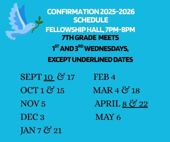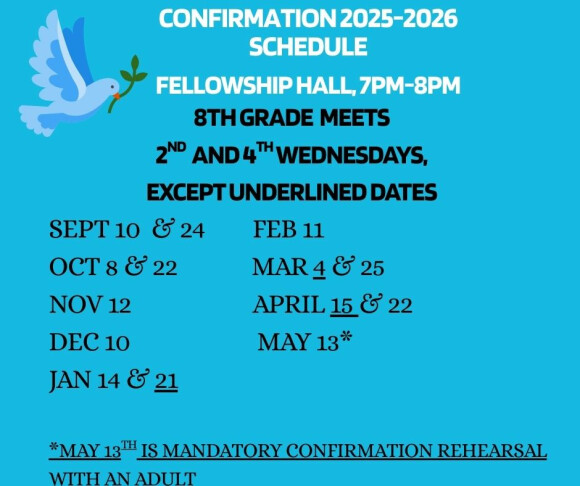 Confirmation Sunday for 8th graders will be on May 17 and 24, 2026